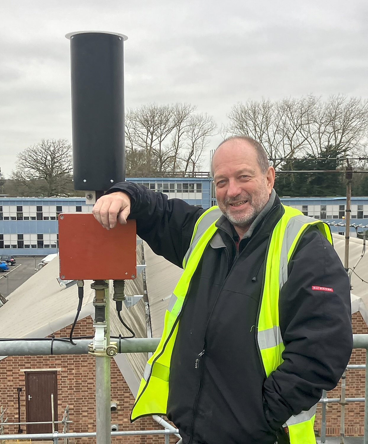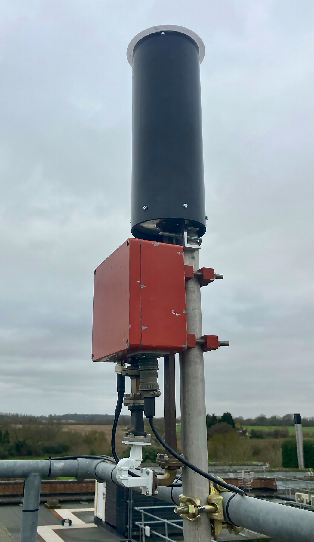 Outdoors: Driver & Kuhne PA, inc tellback, in red diecast box; and dark grey WG16 Antenna/radome - with Andy Tyler G1GKN