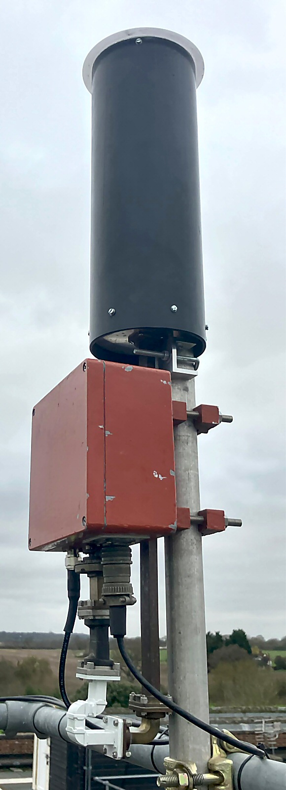 GB3CMS, our microwave beacon, uses a brass 10GHz waveguide double-sided WG16 slotted array for its antenna. Designed and built some years ago, the slots act as a phased array. They radiate the energy in a largely horizontal direction whilst the side-wings convert its azimuth coverage to a more omnidirectional characteristic. Early installations had problems weatherproofing the open slots. Past attempts had tried kapton or thick polythene close to the slots, which either suffered from sunlight & weather, or mismatched it too severely. The current deign is a far more robust one with a custom machined bracket that clamps a dielectric tube and cap to a scaffold pole that also holds the masthead unit.