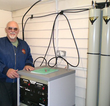 Mike Wheaton G4ZPE (Zipy) pictured with the GB3DB 6m Repeater in the half-size 19" rack. A set of six Procom Cavities are to the right. GB3DB uses pairs of Alinco radios, Mk3 G8CUL logic and a remote control system.