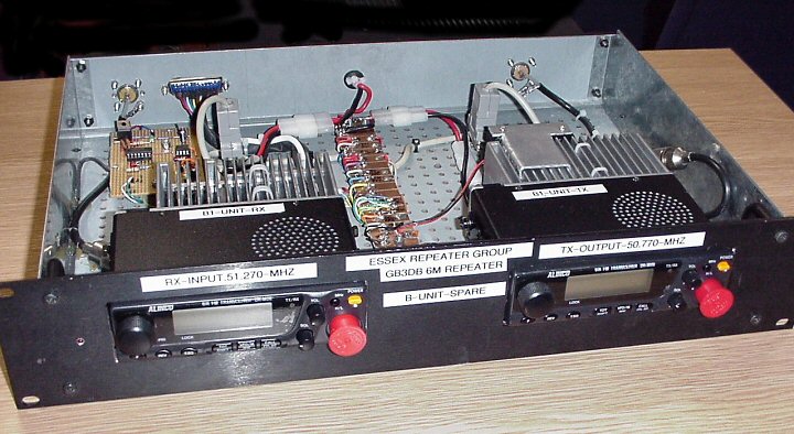 is based on pairs of Alinco radios donated by Waters & Stanton. One is used as transmitter, the other as receiver. This separation assists with logic and desense issues. The spare unit built in 2005 is shown above.