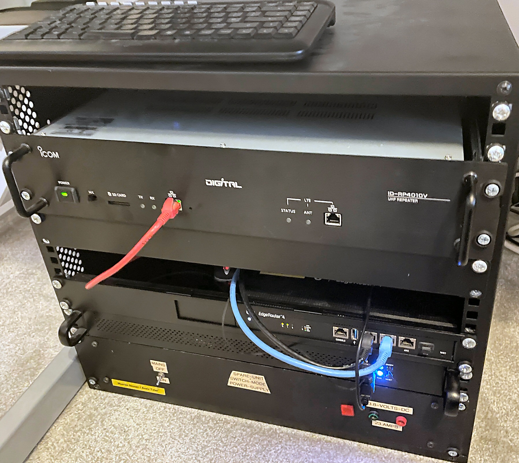 The 2024 rebuilt GB7ZP DStar repeater In mid 2024, courtesy of Icom-UK, the original GB7ZP system was replaced by a new generation Icom RP4010V repeater unit and G3.2/Alma-Linux Gateway and integrated into a new 19" rack. The original duplexer was repackaged into a 1U case and the EdgeRouter also racked together with the radio PSU at the bottom of the stack.